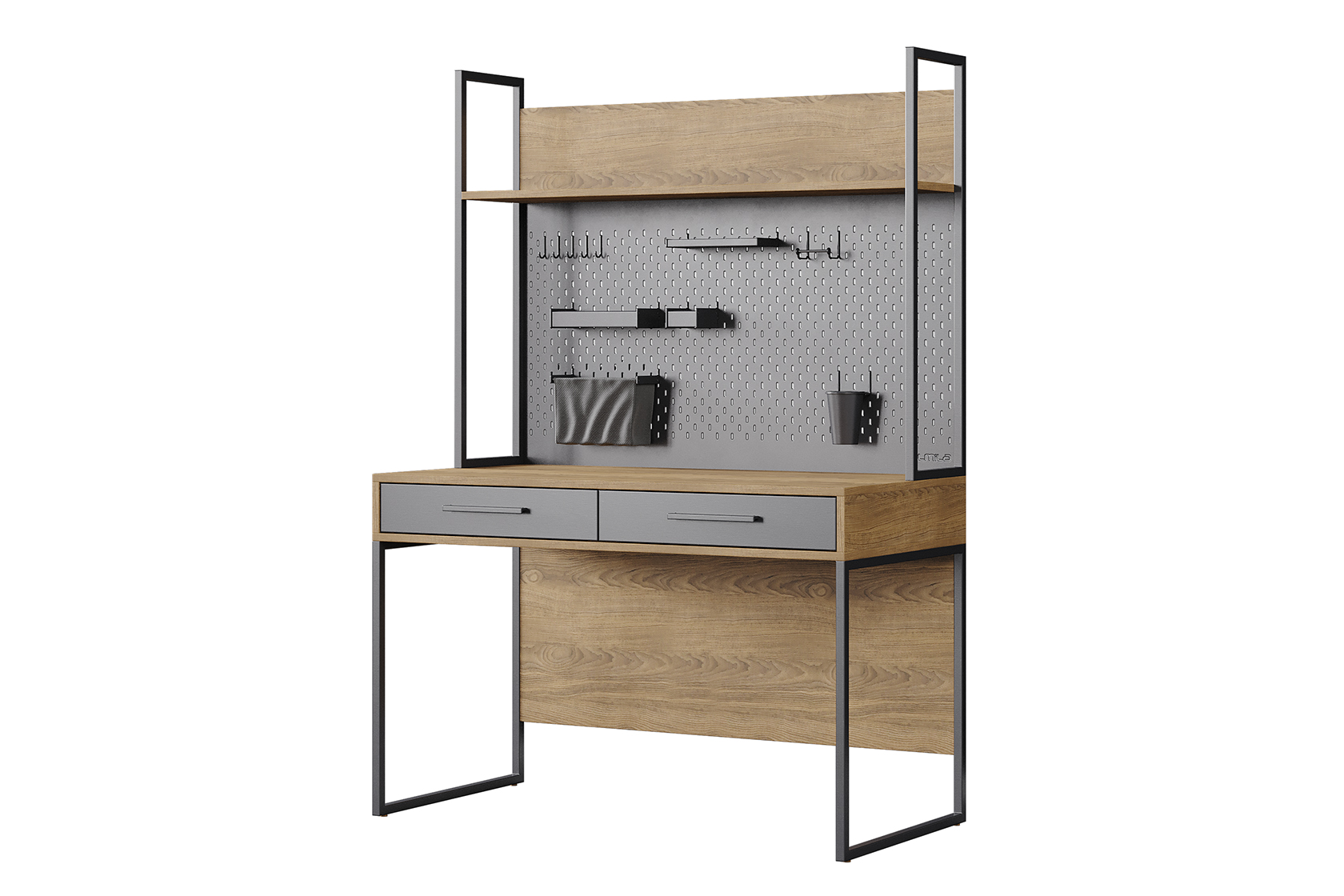 Biroul de studiu Legend cu etajeră superioară, cu dimensiunile de 120×60×172 cm, prezintă un design modern și funcțional, potrivit pentru amenajarea spațiilor de studiu destinate tinerilor. Structura sa include o etajeră superioară deschisă, perfectă pentru depozitarea cărților sau a obiectelor decorative. Biroul dispune de două sertare integrate, oferind spațiu suplimentar pentru organizare. Materialul principal are un finisaj elegant de lemn, completat de elemente metalice de culoare închisă, care adaugă un contrast sofisticat și durabilitate. Aspectul său vizual este unul rafinat, combinând utilitatea cu estetica modernă.