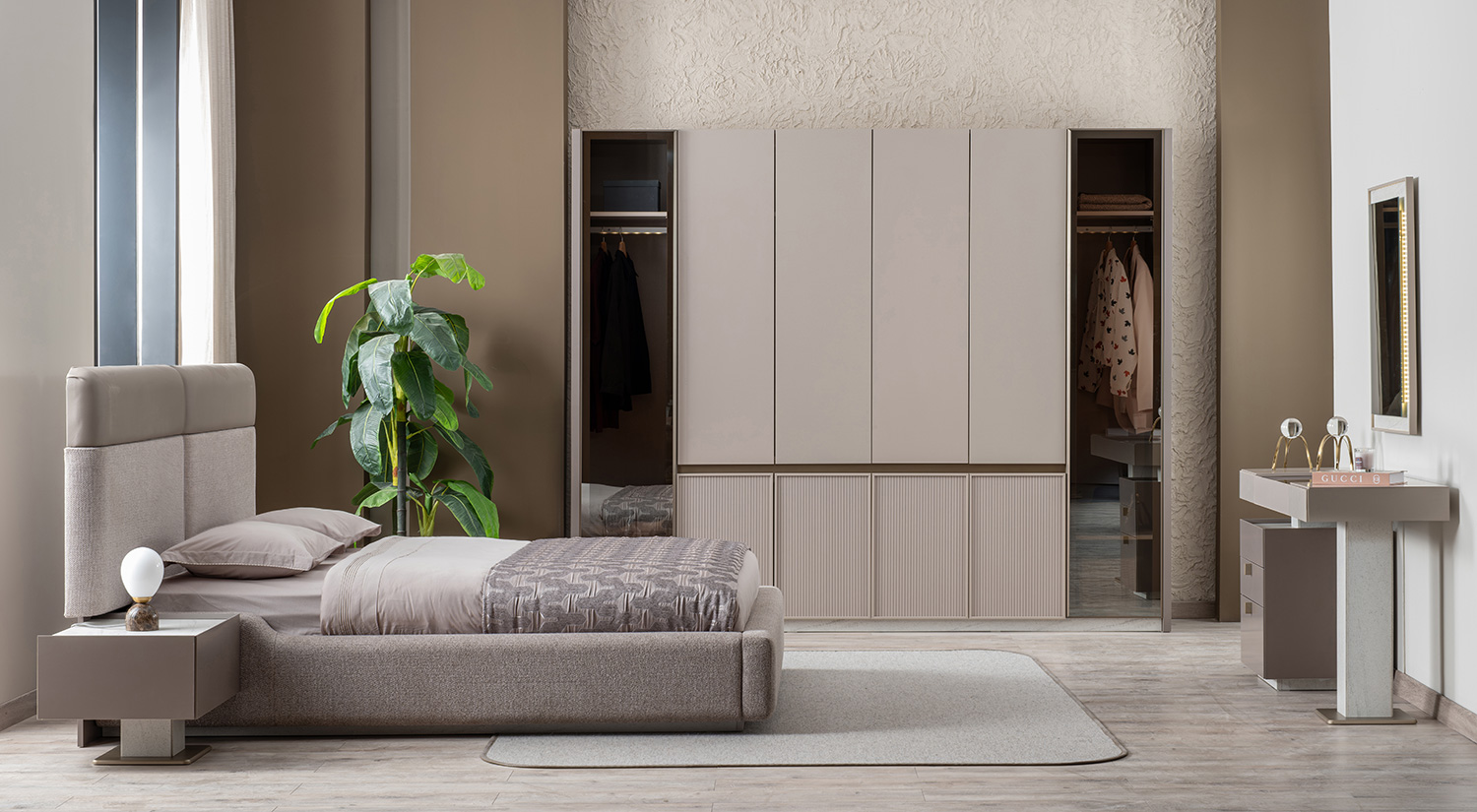 Dulapul Carmen, cu dimensiunile de 268×63×225 cm, prezintă un design elegant și funcțional, având șase uși care oferă acces la spații de depozitare închise. Structura sa este robustă, cu un finisaj modern, în nuanțe neutre, care se integrează armonios în orice decor. Materialul folosit conferă un aspect rafinat și durabilitate, fiind ideal pentru organizarea eficientă a garderobei.