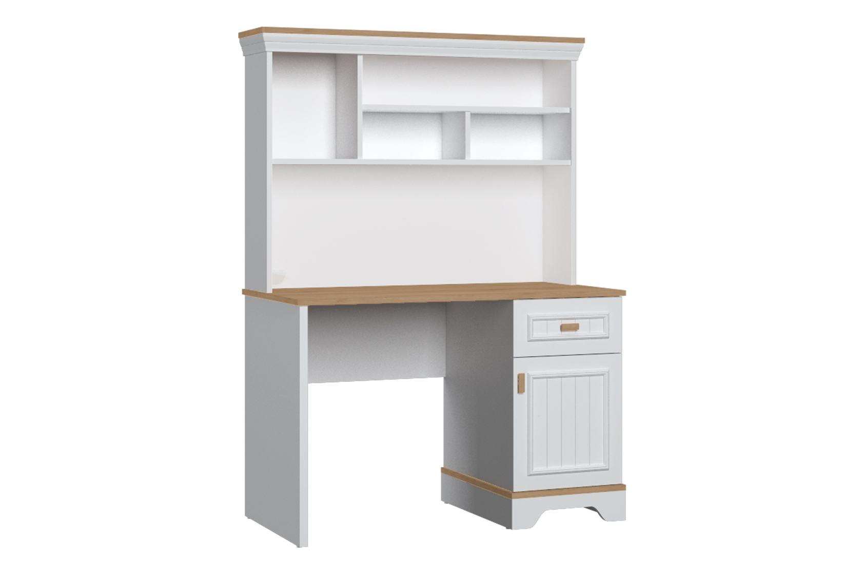 Etajera superioară Monte, cu dimensiunile de 117,6×28,3×86,7 cm, prezintă un design elegant și funcțional, potrivită pentru amenajarea spațiilor de studiu destinate tinerilor. Structura sa include rafturi deschise, oferind acces facil la cărți și accesorii. Finisajul alb, combinat cu un blat superior de culoare lemn natural, adaugă un aspect modern și rafinat, potrivit pentru orice decor de birou. Materialele utilizate sunt de calitate, asigurând durabilitate și stabilitate.