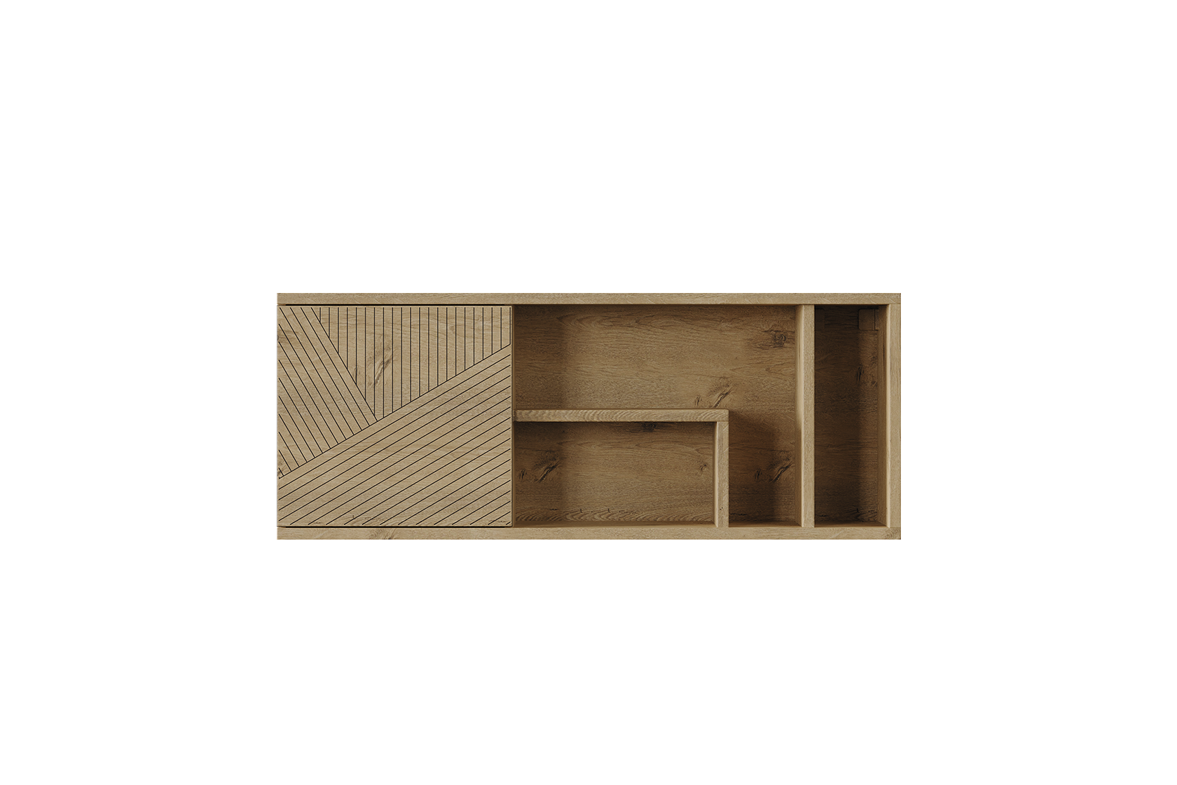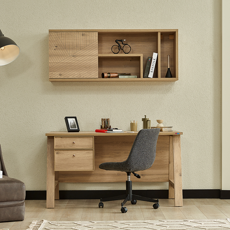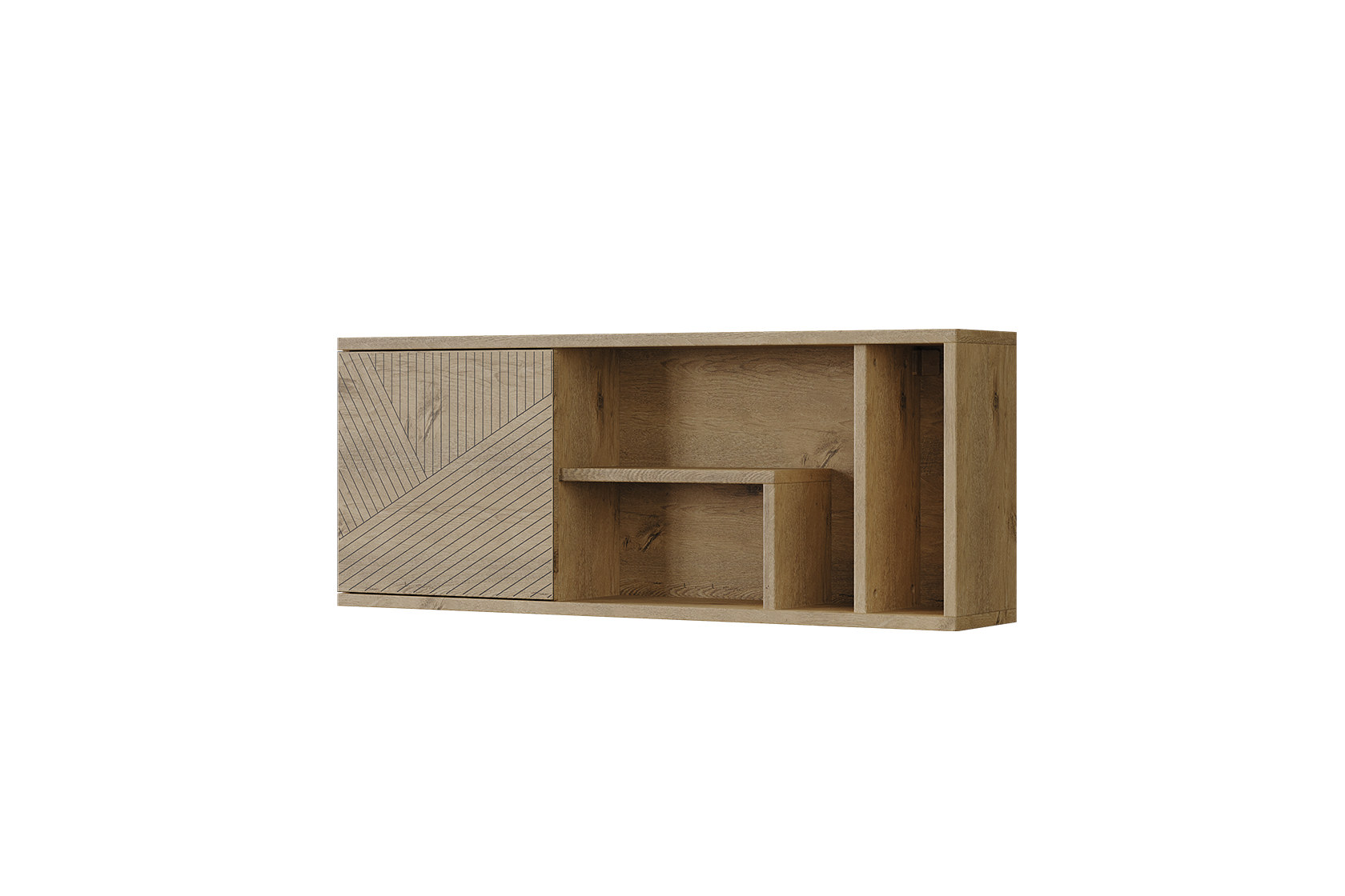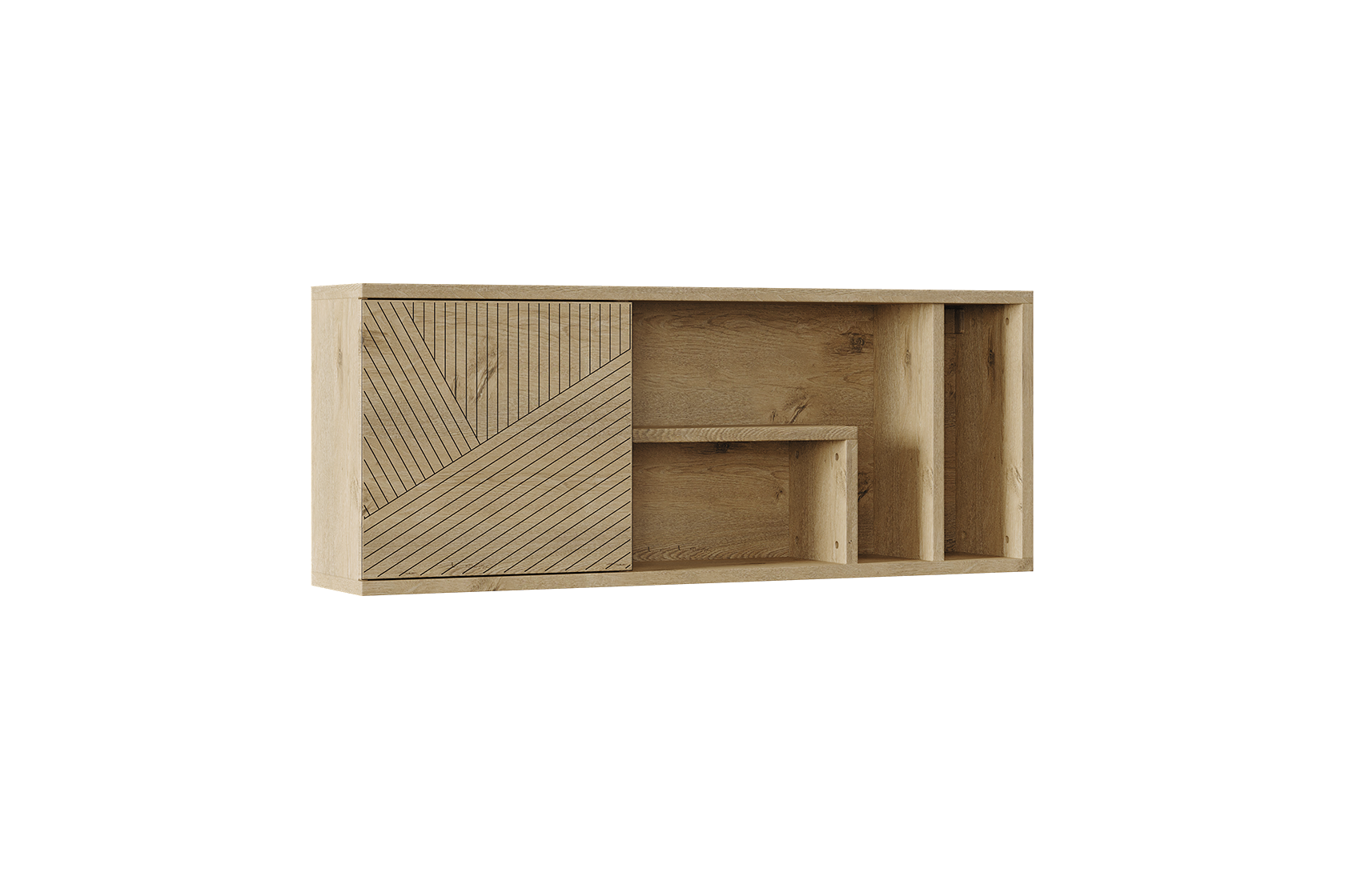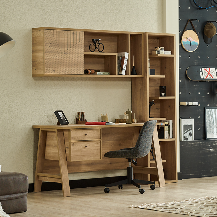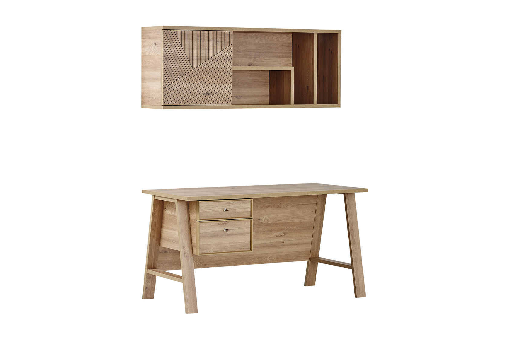 Etajera superioară Origami, cu dimensiunile de 138×26,8×54,5 cm, prezintă un design modern și funcțional, potrivită pentru amenajarea spațiilor de studiu destinate tinerilor. Structura sa include atât rafturi deschise, cât și un spațiu închis cu ușă, oferind versatilitate în organizarea obiectelor. Finisajul din lemn de culoare naturală adaugă un aspect elegant și cald, iar detaliile geometrice de pe ușă conferă un plus de stil. Materialul este robust și de calitate, asigurând durabilitate și stabilitate. Această etajeră este ideală pentru a completa un birou de studiu modern, aducând un plus de organizare și estetică.