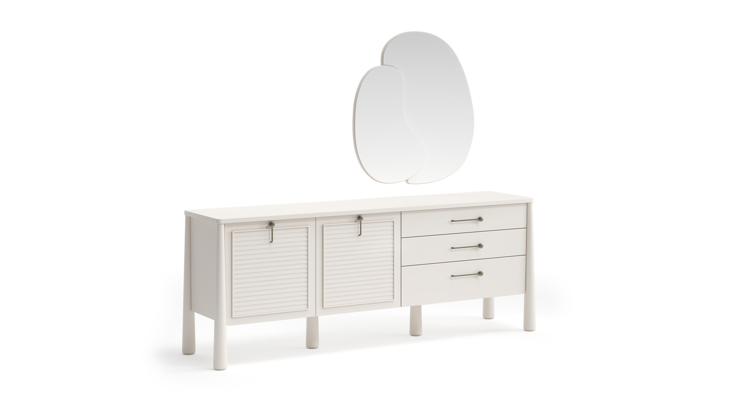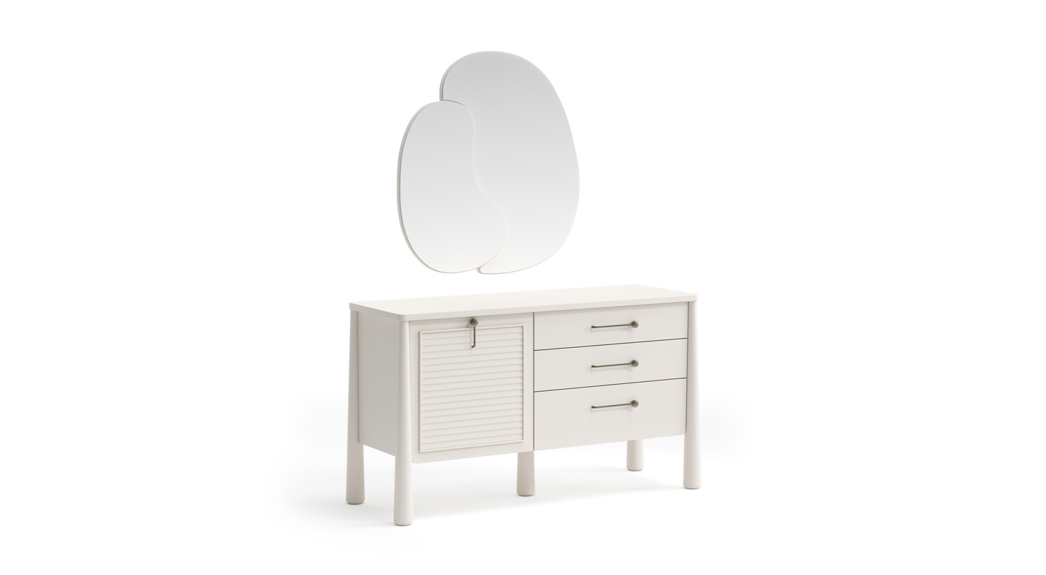 Oglinda pentru comoda/consola Salda, cu dimensiunile de 94×88 cm, prezintă un design modern și elegant, caracterizat prin forme organice și linii fluide. Suprafața oglinzii este netedă și reflectorizantă, oferind un finisaj impecabil. Marginile sunt rotunjite, conferind un aspect sofisticat și armonios. Această piesă de mobilier este ideală pentru a adăuga un accent stilistic oricărui spațiu interior.