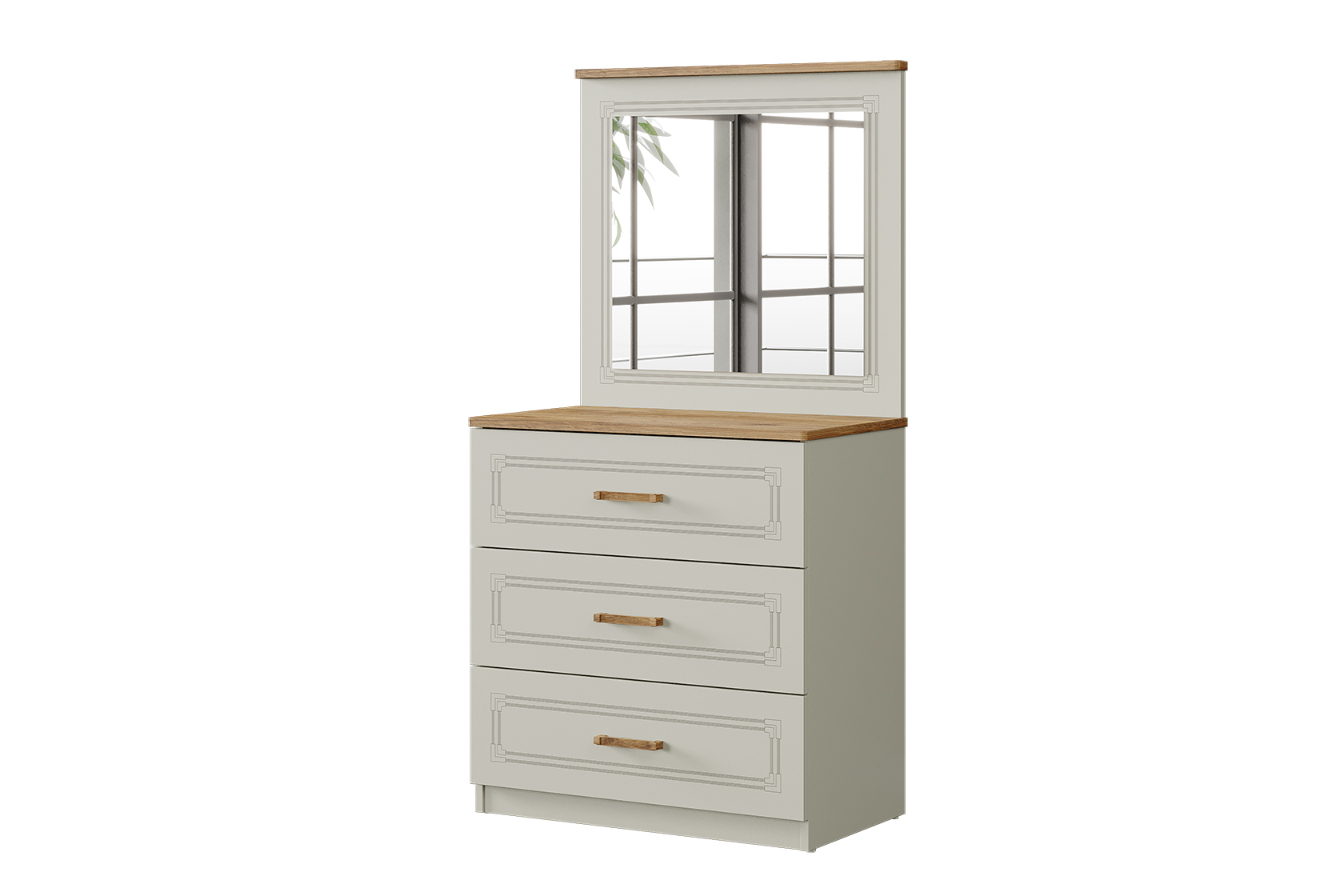 Oglinda pentru dulap Story, cu dimensiunile de 76×6×71,8 cm, îmbină aspectul decorativ cu utilitatea într-un design atent proporționat. Finisajul deschis și detaliile discrete din colțuri oferă un aer rafinat, ușor de integrat în amenajări luminoase și moderne. Elementul din lemn din partea superioară adaugă căldură vizuală și un contrast natural bine echilibrat. Este o piesă potrivită pentru tinerii care își doresc funcționalitate și stil într-un singur obiect, fără a încărca spațiul.