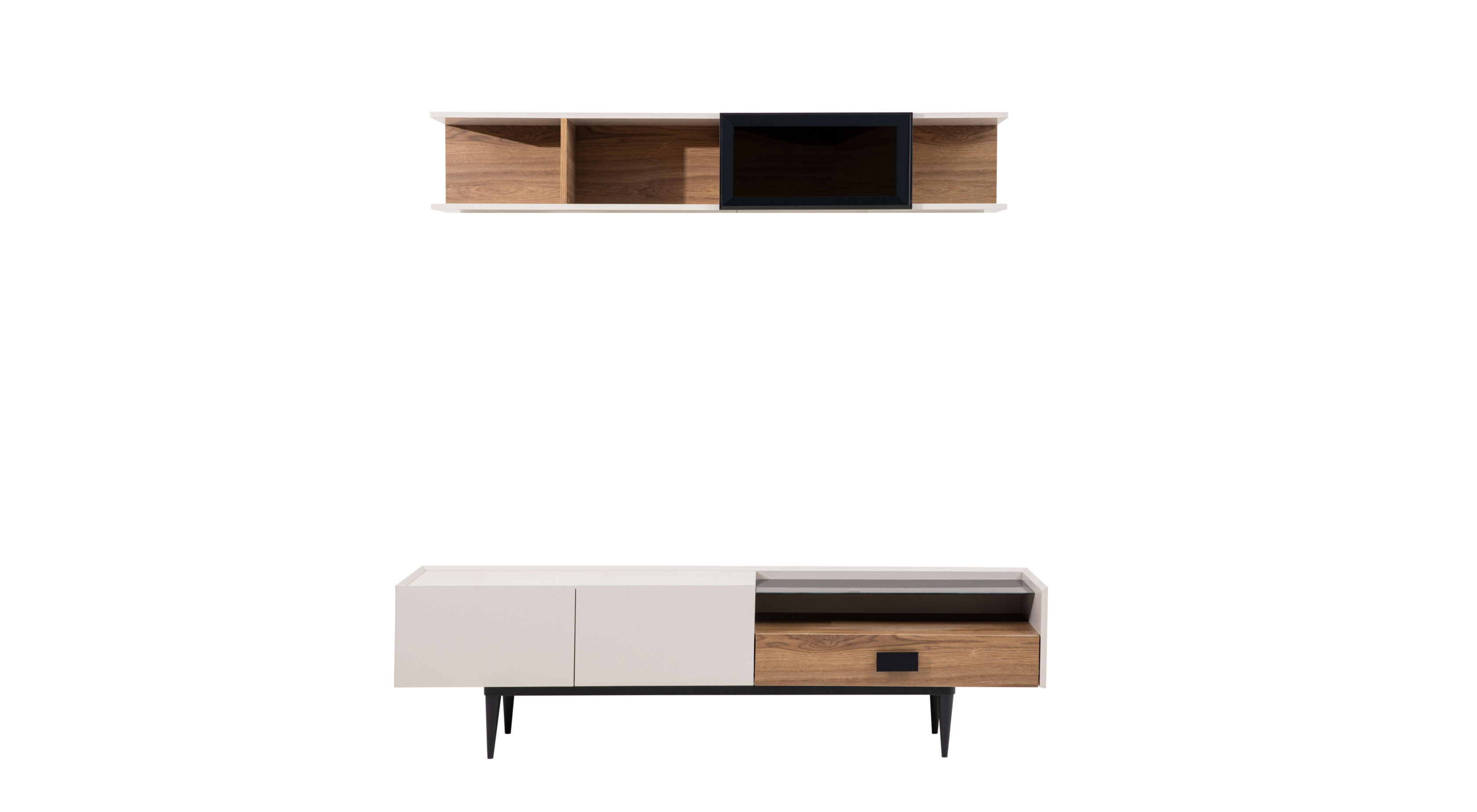 Setul Mobilier TV Aqua se remarcă printr-un design modern și elegant, integrându-se perfect în orice spațiu de living. Structura sa include rafturi deschise, ideale pentru expunerea obiectelor decorative sau a cărților, și spații închise, care oferă soluții de depozitare discrete. Finisajul combină nuanțe de alb și lemn natural, aducând un contrast plăcut și un aspect sofisticat. Materialele utilizate sunt de calitate superioară, asigurând durabilitate și un aspect rafinat. Acest set este alegerea perfectă pentru cei care doresc să îmbine funcționalitatea cu estetica modernă.