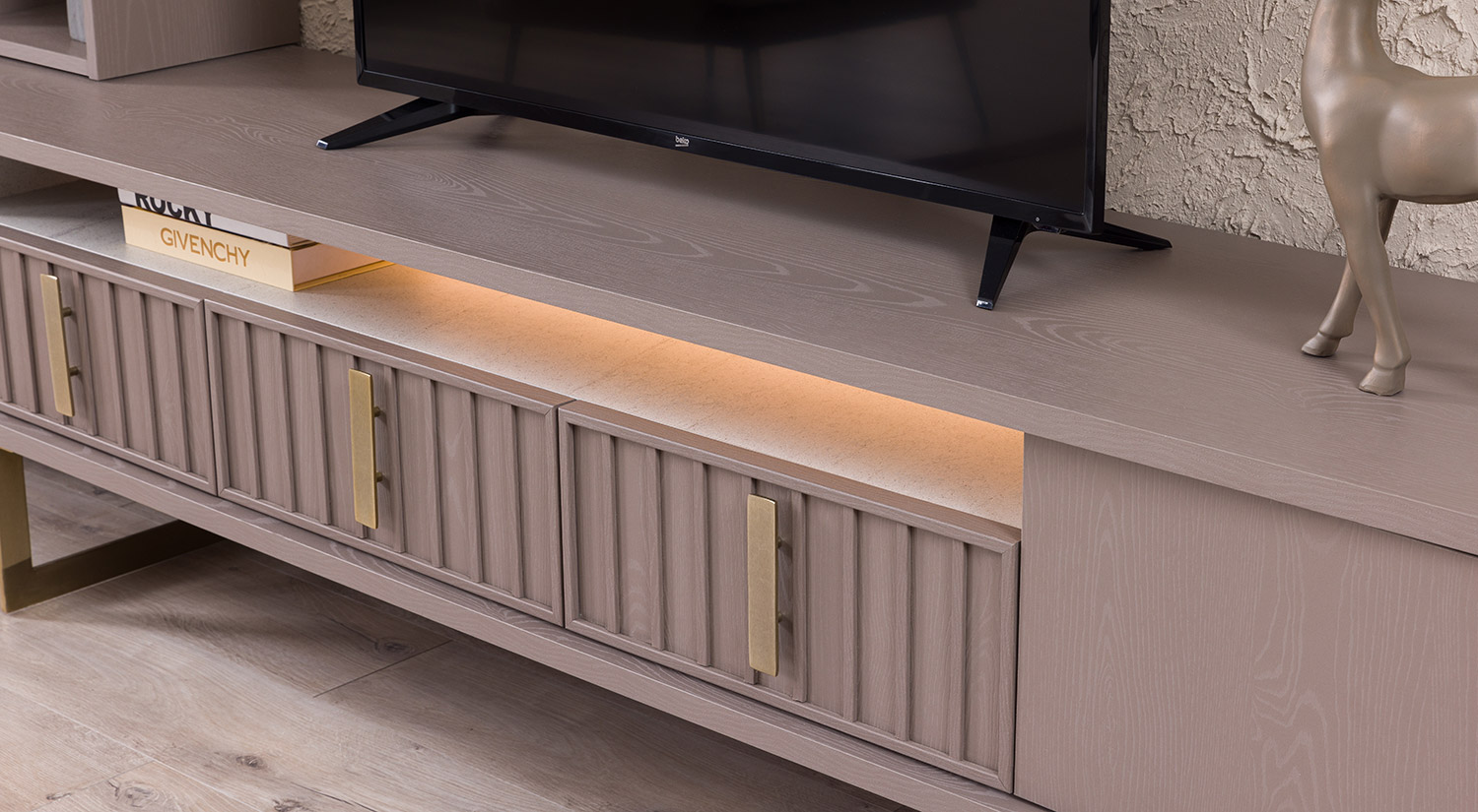 Setul Mobilier TV Latte prezintă un design modern și elegant, cu o structură bine definită. Acesta include rafturi deschise, ideale pentru expunerea obiectelor decorative, și spații închise cu uși, oferind soluții de depozitare discrete. Materialul are un finisaj neted și sofisticat, cu o nuanță caldă, care completează armonios orice decor interior. Designul său contemporan și funcționalitatea îl fac o alegere excelentă pentru livingul modern.