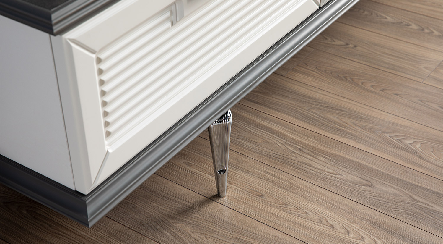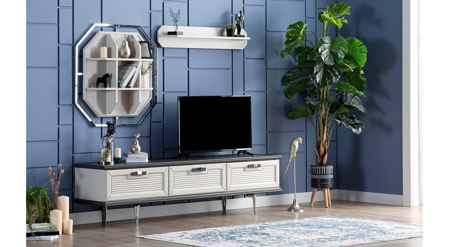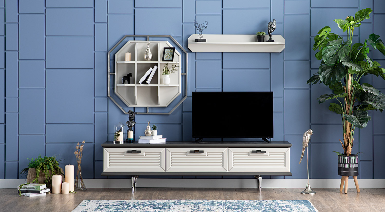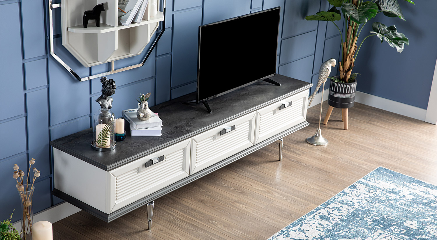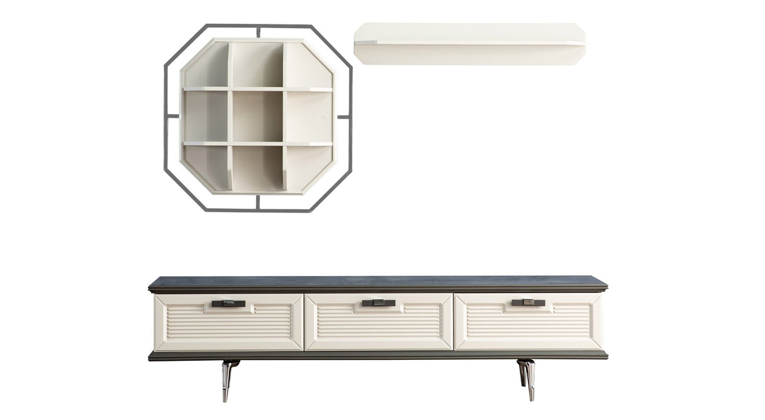 Setul Mobilier TV Marmaris prezintă un design modern și elegant, cu un finisaj rafinat. Structura include un corp principal cu uși închise, oferind un spațiu generos pentru depozitare. Deasupra, se află un raft deschis, ideal pentru expunerea obiectelor decorative. Materialul are un aspect neted și sofisticat, completat de detalii metalice care adaugă un plus de stil. Acest set este perfect pentru a aduce un aer contemporan și funcțional în orice living.