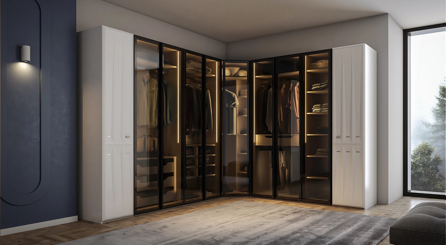Setul Mood Natura este un ansamblu de mobilier elegant și modern, caracterizat printr-o combinație de spații deschise și închise. Structura include uși din sticlă fumurie, care oferă un aspect sofisticat și permit vizualizarea conținutului interior. Iluminarea interioară subtilă adaugă un plus de rafinament și funcționalitate. Materialele utilizate au un finisaj neted și lucios, contribuind la un design contemporan și atractiv. Acest set este ideal pentru organizarea eficientă și stilată a spațiului de locuit.
