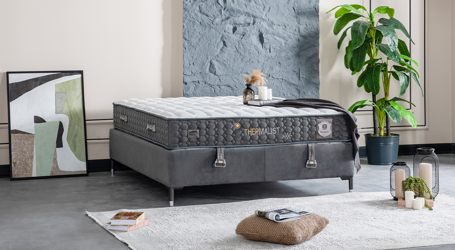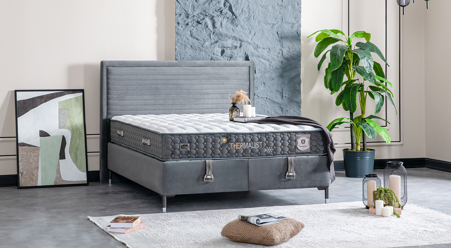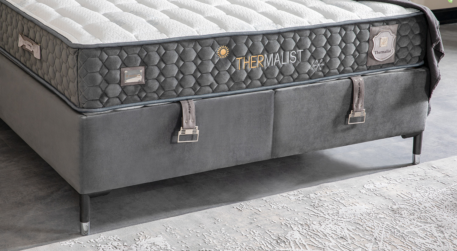 Setul de pat cu bază și tăblie Thermalist prezintă un design modern și elegant, cu o structură robustă. Tăblia înaltă, tapițată, adaugă un plus de rafinament și confort vizual. Materialul folosit pentru finisaj este de calitate superioară, oferind un aspect sofisticat și durabil. Baza patului este solidă, completată de un finisaj uniform și elegant. Acest set este ideal pentru cei care caută un echilibru între stil și funcționalitate în amenajarea dormitorului.