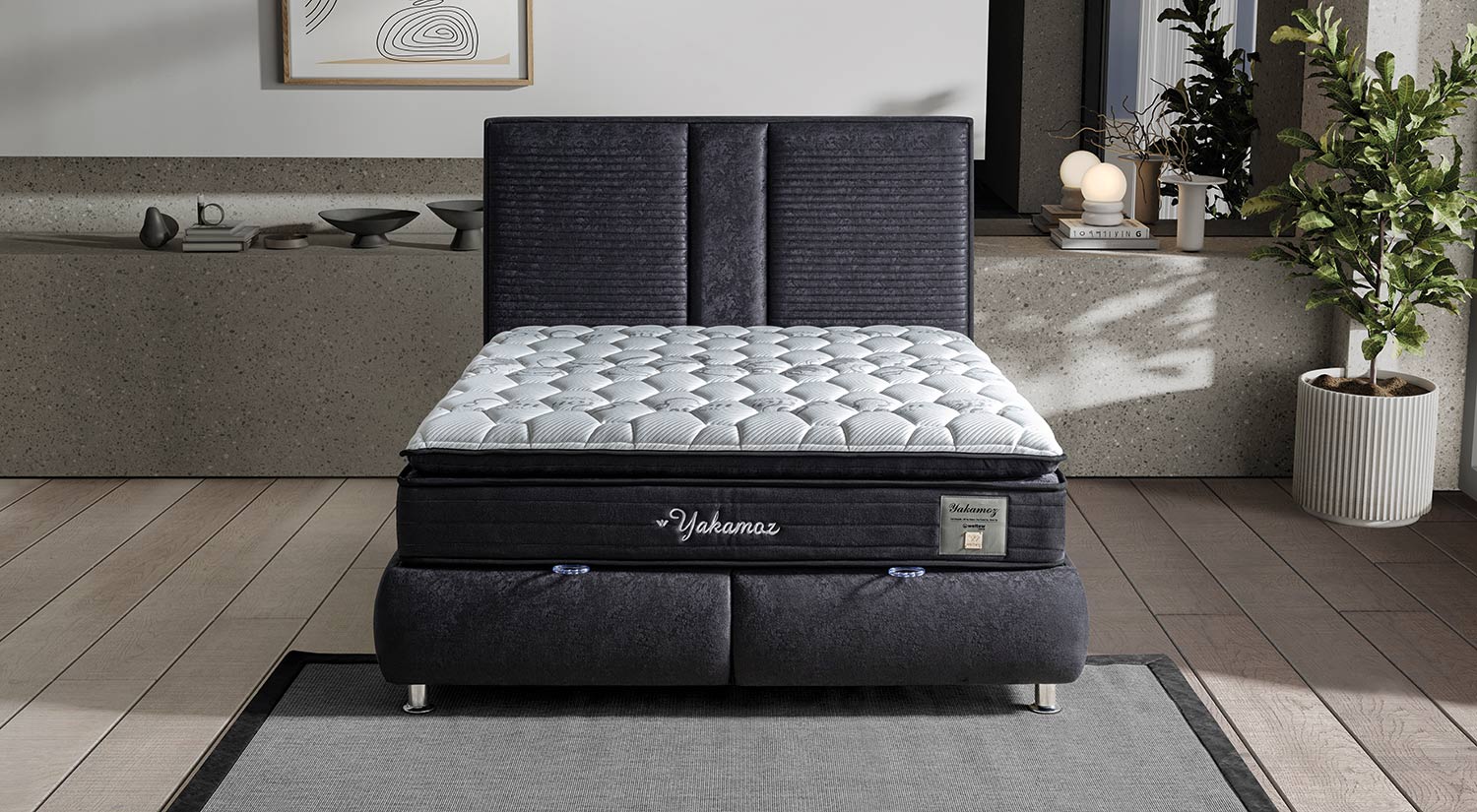 Tăblia de pat Yakamoz prezintă un design modern și elegant, cu un finisaj texturat și linii orizontale distincte în partea superioară. Materialul are un aspect mat, oferind o senzație de rafinament și durabilitate. Structura este compactă, accentuând un stil minimalist și sofisticat. Această tăblie este ideală pentru a adăuga un plus de stil oricărui dormitor modern.